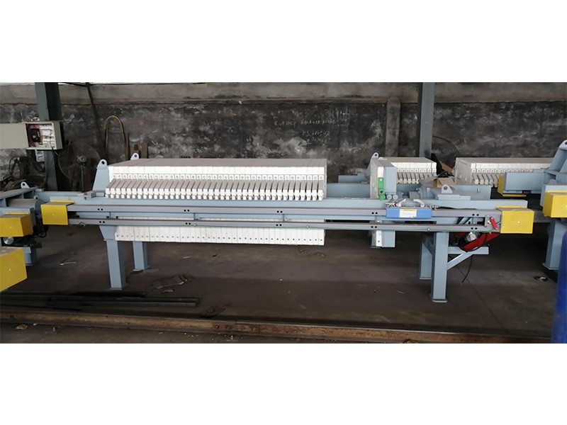 1,主機部分:主機由兩根橫梁,其兩端分別固定在止推板和液壓缸座的兩側面,構成機架。在左右橫梁上垂直擱置、依次排列著由濾框、濾板、濾布組成的若干濾室;并可沿橫梁作水平方向移動。壓緊板與活塞桿鉸接。由液壓缸活塞驅使前后移動,壓緊濾框、濾板,達到液壓工作壓力后,旋轉鎖緊螺母鎖緊保壓。再關閉電機,即可進料過濾。
